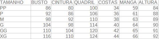 Importante: Antes de efetuar a compra, consulte a tabela de medidas abaixo para ter certeza de receber um produto certo para seu tamanho.
