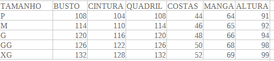 Importante: Antes de efetuar a compra, consulte a tabela de medidas abaixo para ter certeza de receber um produto certo para seu tamanho.
